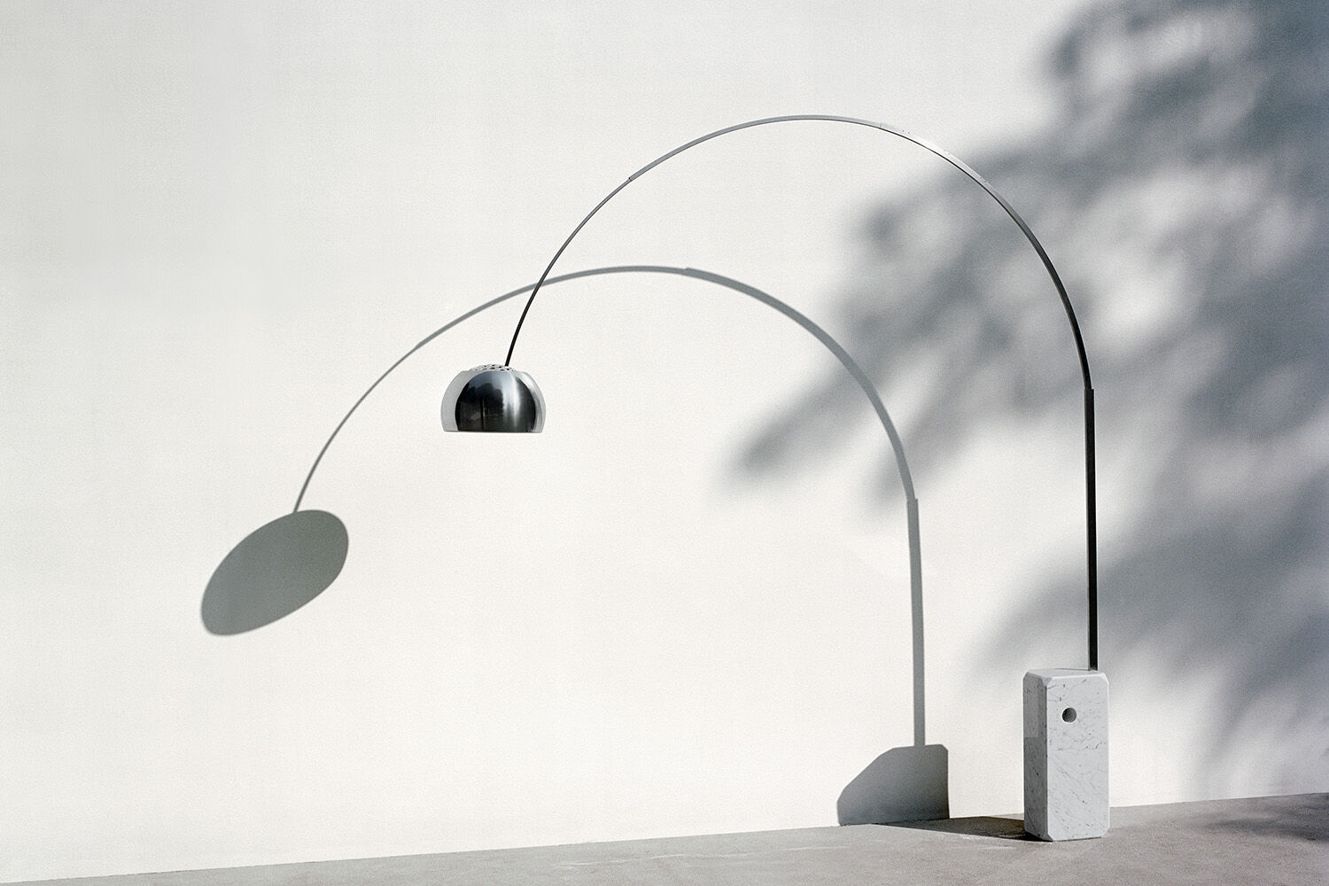 In the original Arco lamp, a telescopic stainless steel arch allows light to be diffused through the adjustable reflector, while the heavy marble base -about 50 kg- anchors the entire structure to the ground. In this ingenious lamp nothing is left to the imagination. Every element has a specific function and is in strict equilibrium with the others. The small hole in the base -coinciding with its center of gravity- is not a simple decorative detail but a device for movement. In fact, it ensures the possibility of transporting the lamp through the admission of a broom stick or similar handle.